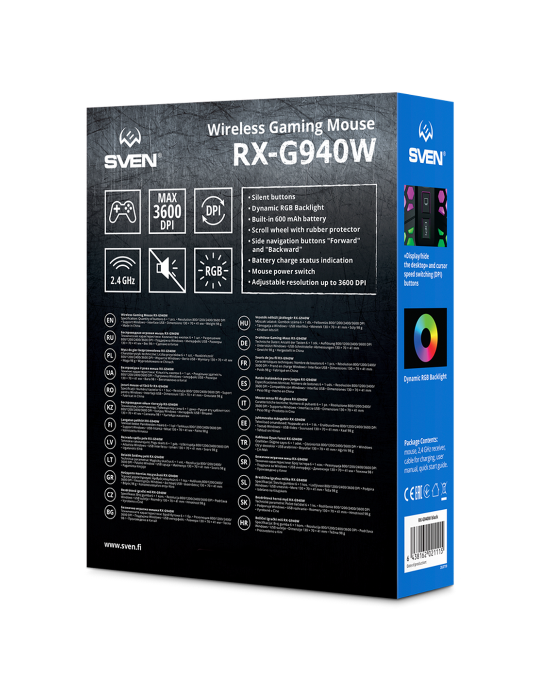 SVENMouse-ul wireless SVEN RX-G940W oferă precizie de 800-3600 dpi, 7 butoane, design ambidextru și iluminare RGB.